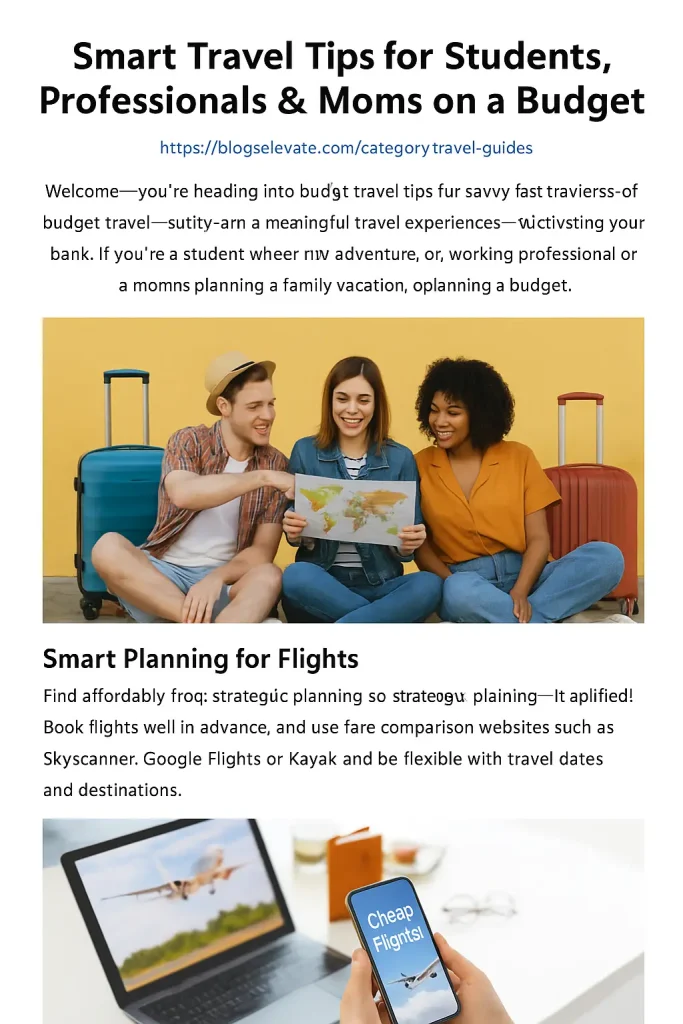 Travel doesn’t have to drain your wallet or leave you stressed. With these essential budget travel tips, students, professionals, and moms can save money, stay organized, and make every trip memorable.Ready for your next adventure? Start planning with BlogElevate and dive into our Travel Guides for affordable destinations, itineraries, and expert hacks.